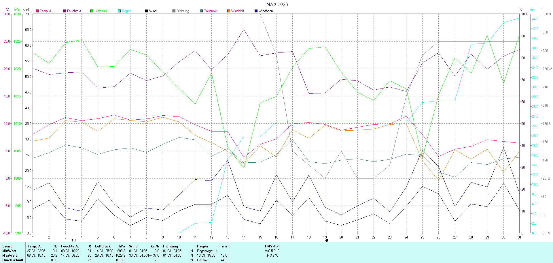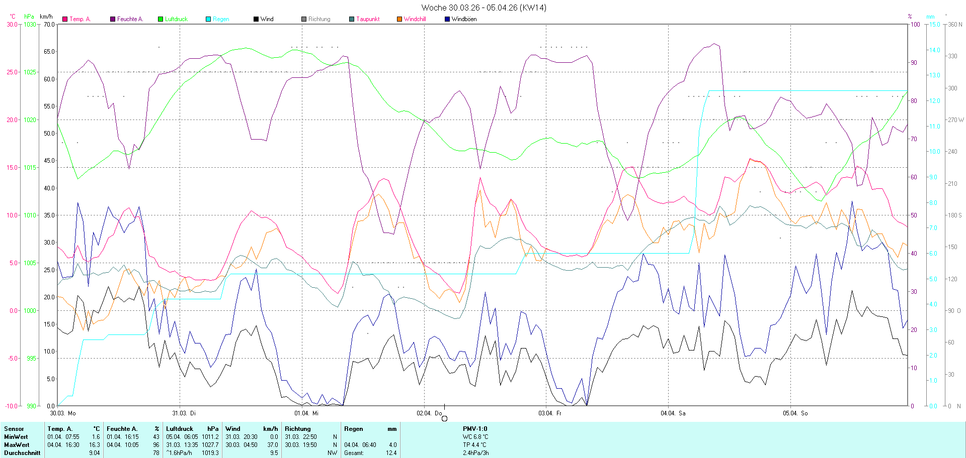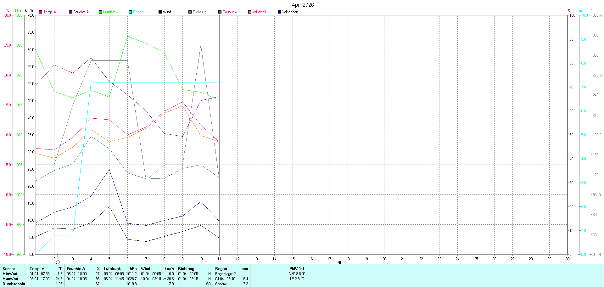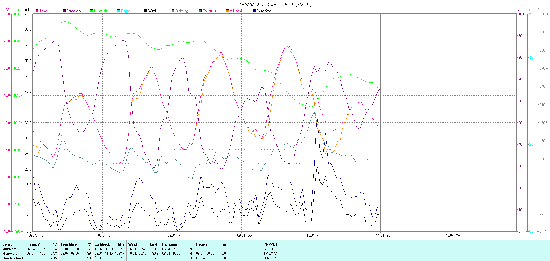 | Die dargestellten Werte repräsentieren die Daten der letzten 24 Stunden! Der Luftdruck ist auf Meereshöhe bezogen! |